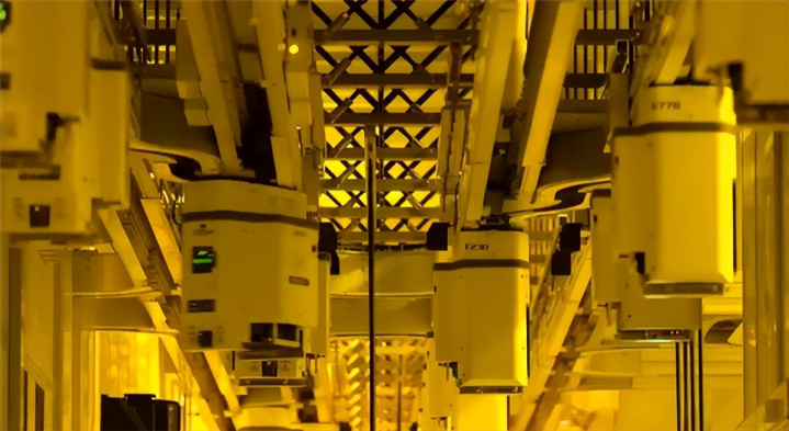 影片开场呈现了被称为 “银色高速公路” 的台积电自动化物料处理系统(AMHS),该系统由悬空轨道构成,专门运输装载 300mm(12吋)晶圆的前开式晶圆传送盒(FOUP)。